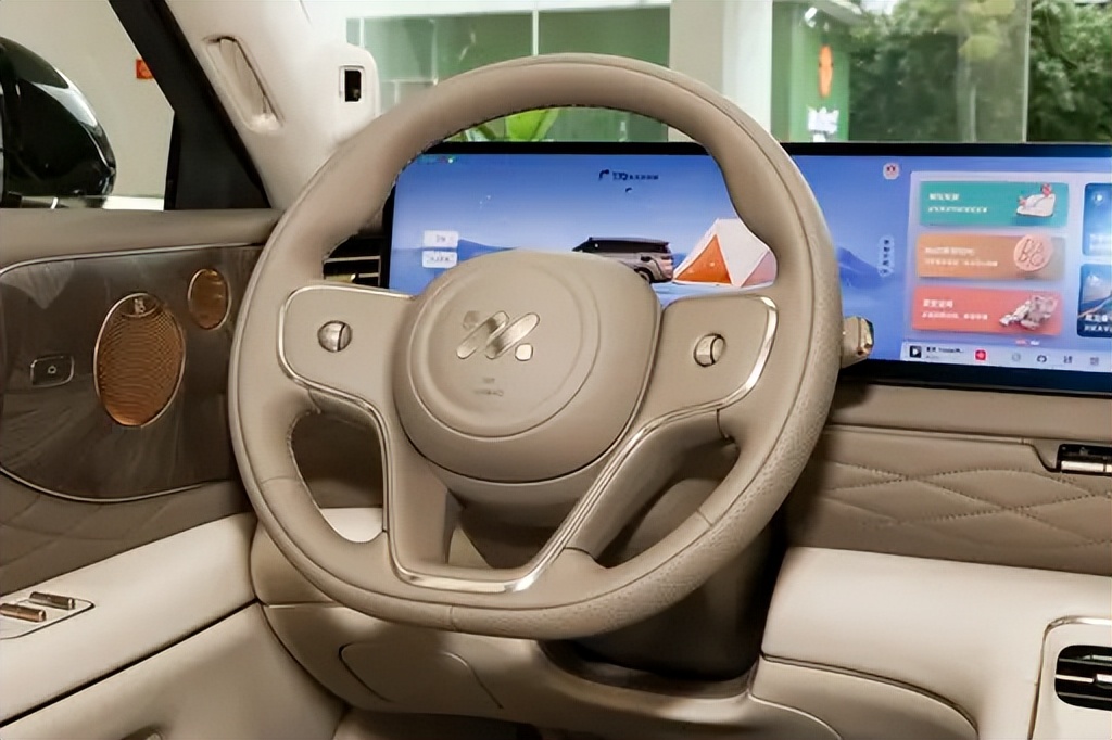进入车内,智己LS9的内饰风格与外观保持了高度统一,整体氛围偏向沉稳、高级,并没有刻意营造“未来感过剩”的视觉冲击,而是强调舒适与实用。中控区域以大尺寸屏幕为设计核心,仪表与中控采用一体式超宽屏布局,整体尺寸达到27.1英寸,在视觉完整性和信息整合度上明显优于传统双联屏设计。